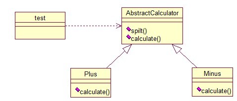 就是在AbstractCalculator类中定义一个主方法calculate,calculate()调用spilt()等,Plus和Minus分别继承AbstractCalculator类,通过对AbstractCalculator的调用实现对子类的调用,看下面的例子: