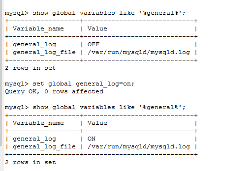 show global variables like '%general%'; //查看 set global general_log = on; // 打开 -- set global general_log = off; // 关闭