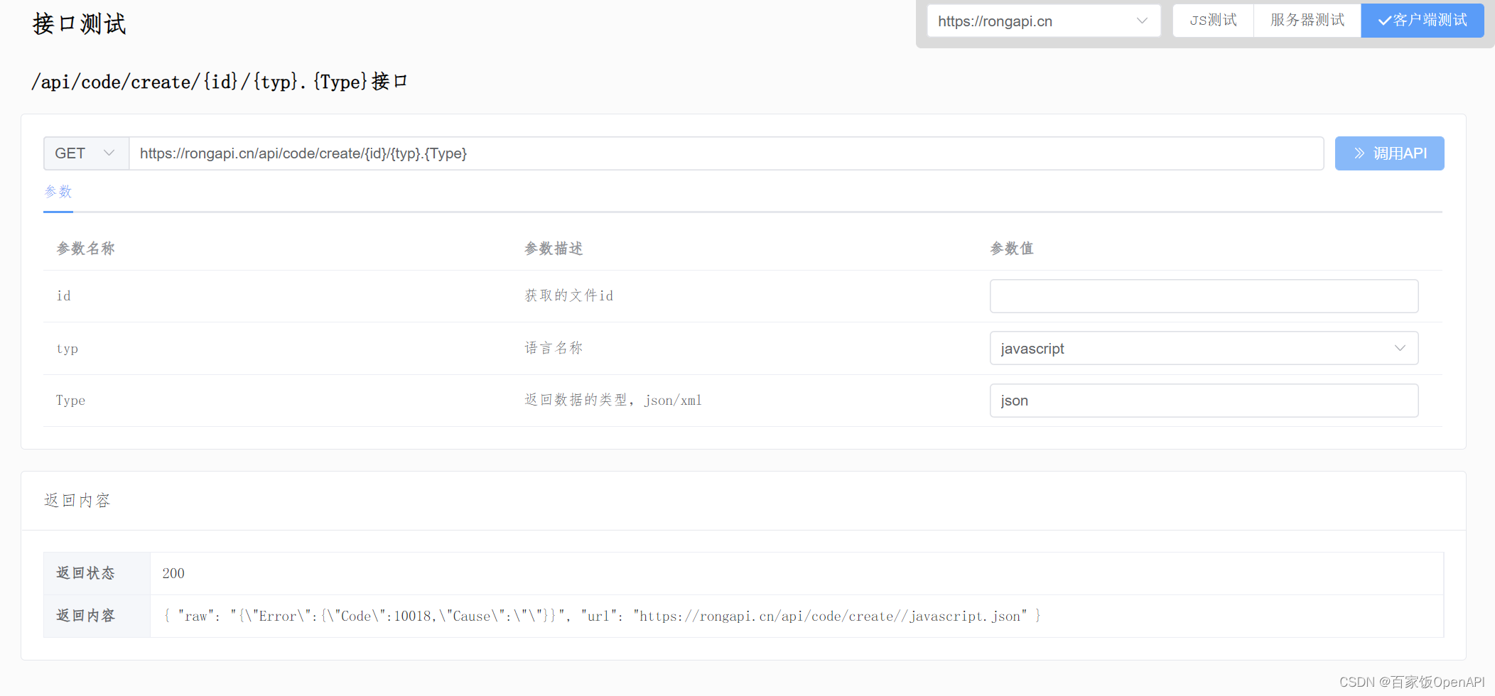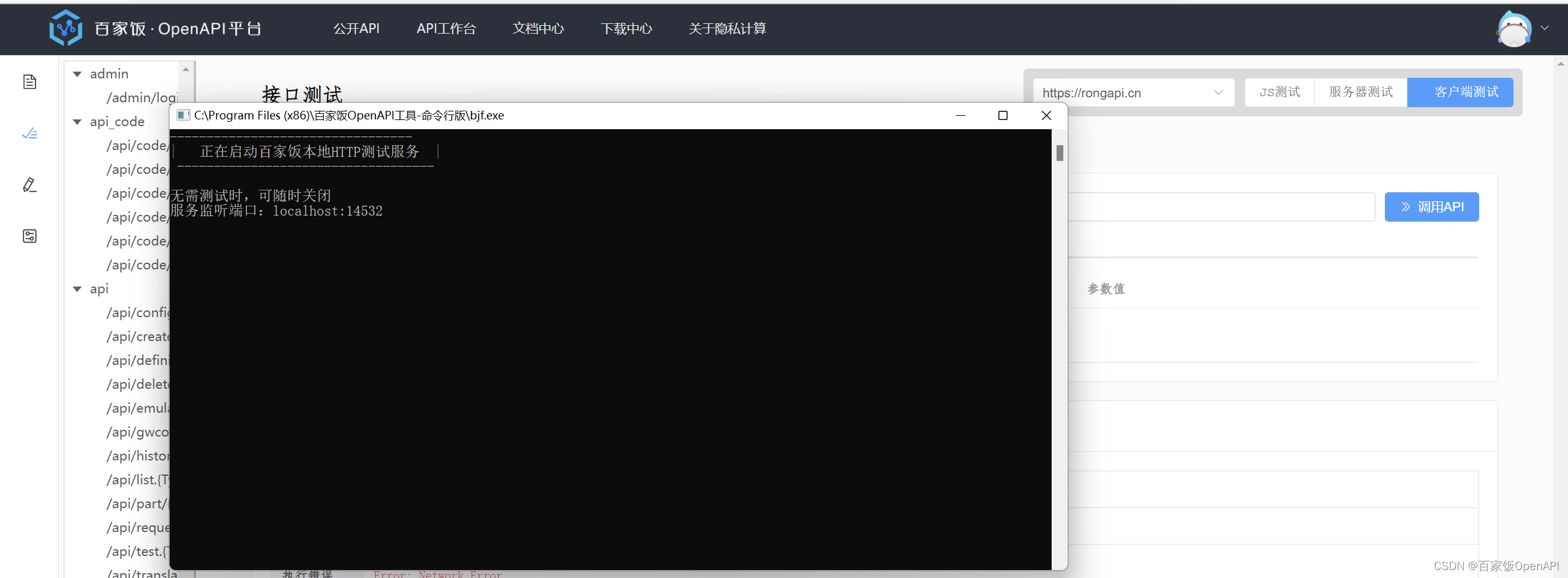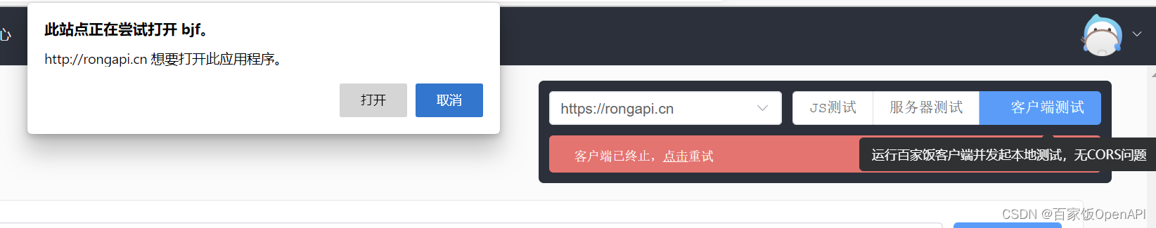 3. 客户端测试:为了解决CORS问题,同时满足测试本地环境的需要,平台支持配合百家饭客户端实现客户端本地测试的功能。如果安装了v0.6.0以上版本的客户端,点击客户端测试会要求使用