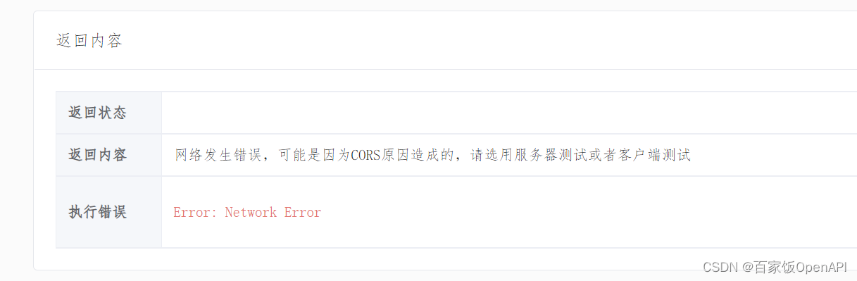 2. 服务器测试: 服务器测试使用百家饭后台服务器发起API请求,一般不会出现CORS问题。但是因为请求是由百家饭平台代发,可能无法反应本地的网络情况。