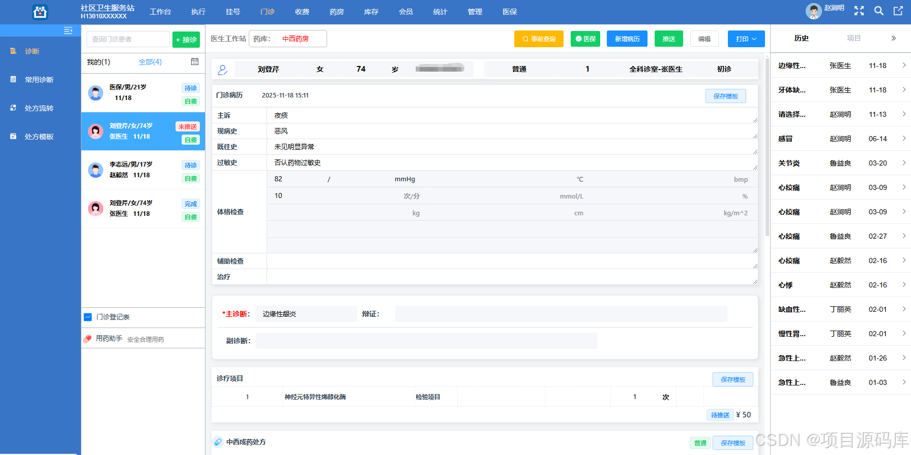 实现病历模板、处方模板的保存和调用;实现既往病历和既往处方的复制和打印;实现病历的常用选择,快速创建病历;实现通过姓名、拼音、手机号、身份证号等条件快速查询既往患者信息,快速就诊登记。