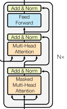 模型的解码器同样是堆叠了N个相同的层,不过和编码器中每层的结构稍有不同。对于解码器的每一层,除了编码器中的两个子层Multi-Head Attention和Feed Forward,解码器还包含一个子层Masked Multi-Head Attention,如图中所示每个子层同样也用了residual以及layer normalization。