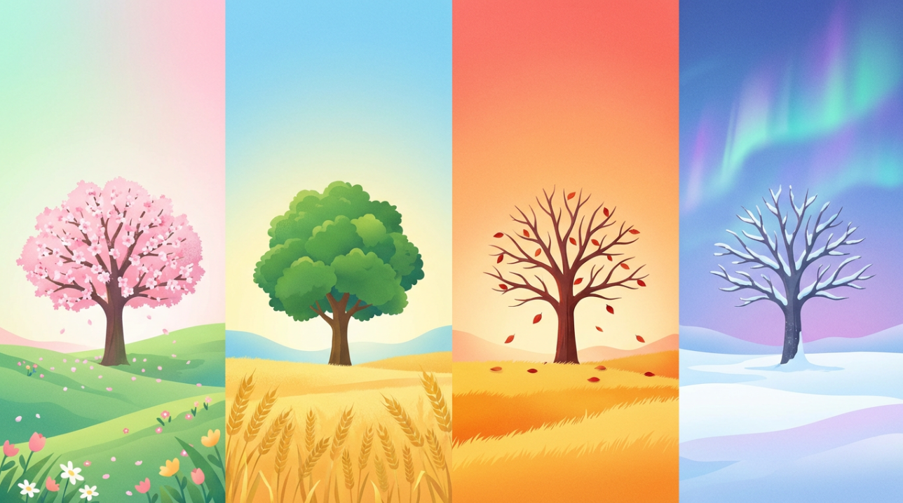 四季主题16:9插画:画面垂直分为四个部分,每个部分运用冷暖渐变色和极简的光影来描绘春、夏、秋、冬。每个部分的中心只画有一棵树,其枝叶与能体现季节变化的背景细节(雪地、花朵、绿坡、金色麦田)相呼应。整体采用柔和的粉蜡色调、扁平质感和颗粒图案,使不同季节既独立又和谐。