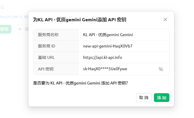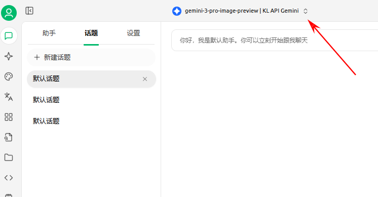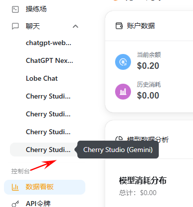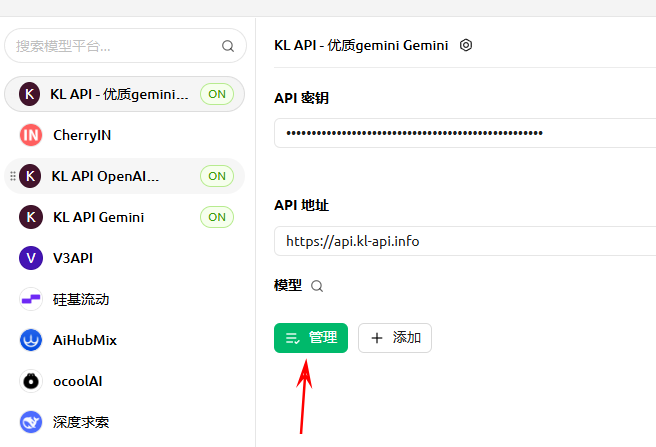 3. 在 KL大模型API中转平台 的左侧菜单里,点击图片上的菜单栏,选择要使用的gmini令牌,然后会自动唤起cherry studio进行渠道配置。