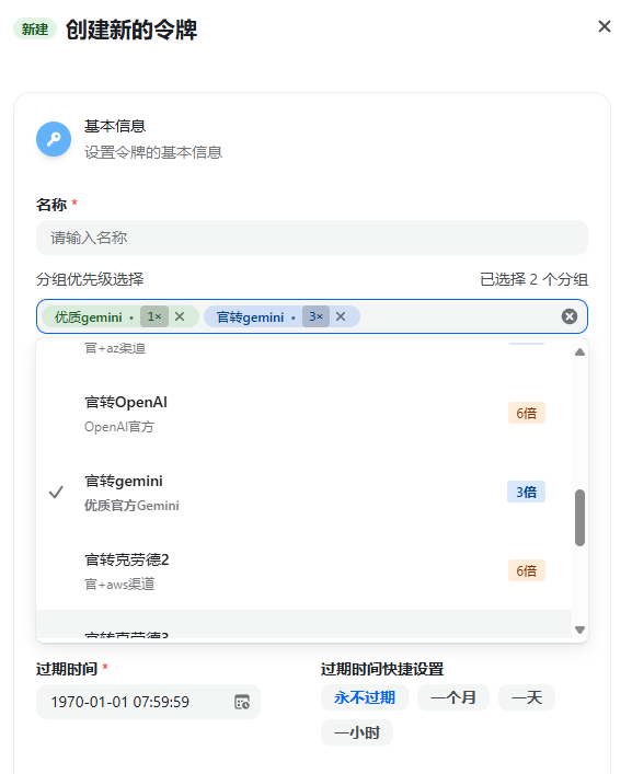 同样的还是去我们的中转站 KL大模型API中转平台 进行账号注册,同时生成对应的令牌。注意,令牌一定要选择Gemini相关分组的,比如优质gemini和官转gemini,建议使用优质gemini分组,原因就是便宜。