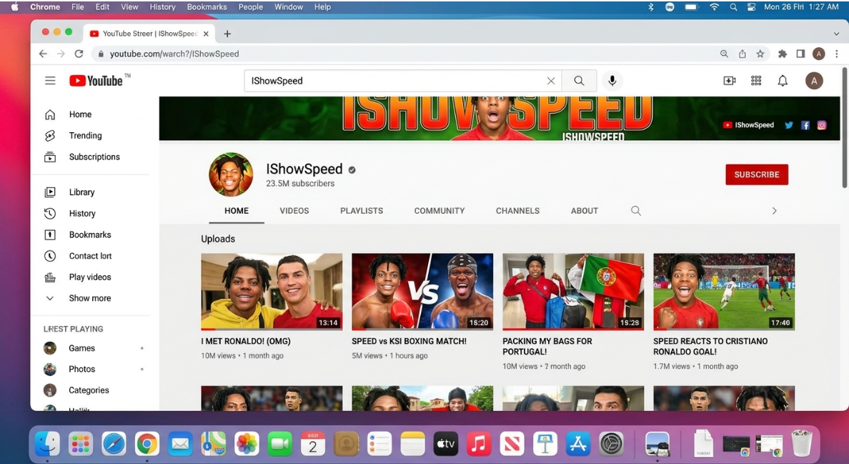 生成一张MacOS桌面截图,桌面上已打开Google Chrome浏览器。在浏览器窗口中,展示YouTube网站,并显示IShowSpeed 频道的视频缩略图。