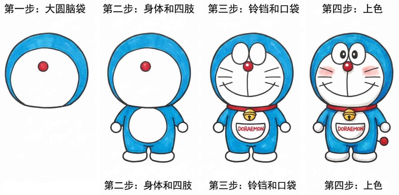 Q版多啦A梦简笔画教程,分步图解,第一步画大大的圆形脑袋,逐步添加身体和四肢,最后上色,可爱风格,线条流畅,马克笔质感