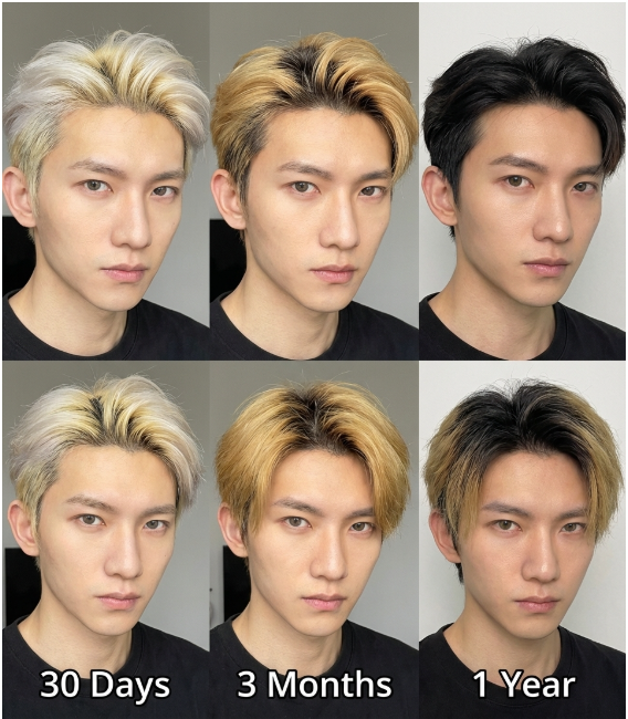 展示这个人头发褪色的过程,分别是30天,3个月,1年