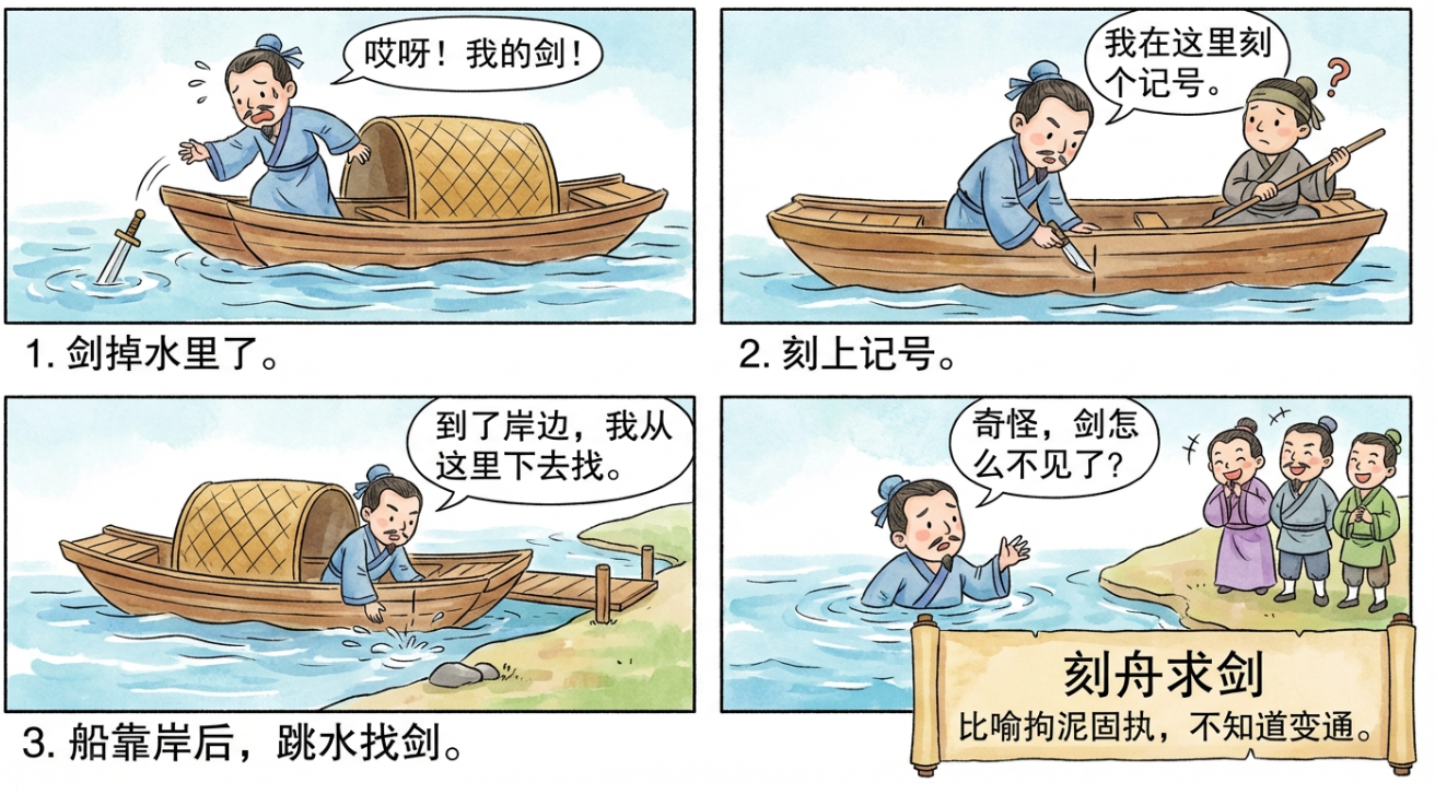 生成一张小学生看的四格成语漫画,漫画讲的是“刻舟求剑”成语的故事。