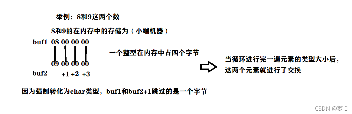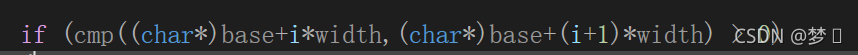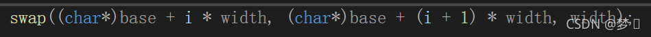 因为char*为最小的指针类型,char*+1类型每回跳过一个字节,因为我们不清楚所需要排序的数组类型,所以我们选择char*类型,最小并且是最细的方法,把数组的首元素强制类型转化后,后面加上 i*width(实际数组元素的大小),就是可以得到我们实际数组的元素地址。如果这里我们采用int*,int*+1跳过的是四个字节,如果排序的数组是char类型,这样的就获得不了数组的所有元素地址,所以我们需要采取最小最细的类型去对获取数组元素的地址