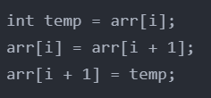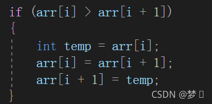 如上代码我们是将数组元素升序排列,所以判断是不是有前面的元素比后面的元素小的这种情况,如果有进入 if 语句,进行元素的交换