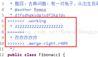 ①将主干文件中的修改同步合并到分支。主干文件右键“Team”→“合并”,合并后有冲突的地方会如下显示。合并时不要勾选“Perform pre-merge best practices checks”;