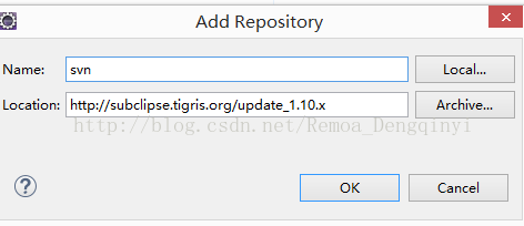 ②若不存在,Help→Install new software,弹出对话框中点击“add”,输入网址http://subclipse.tigris.org/update_1.10.x进行下载;