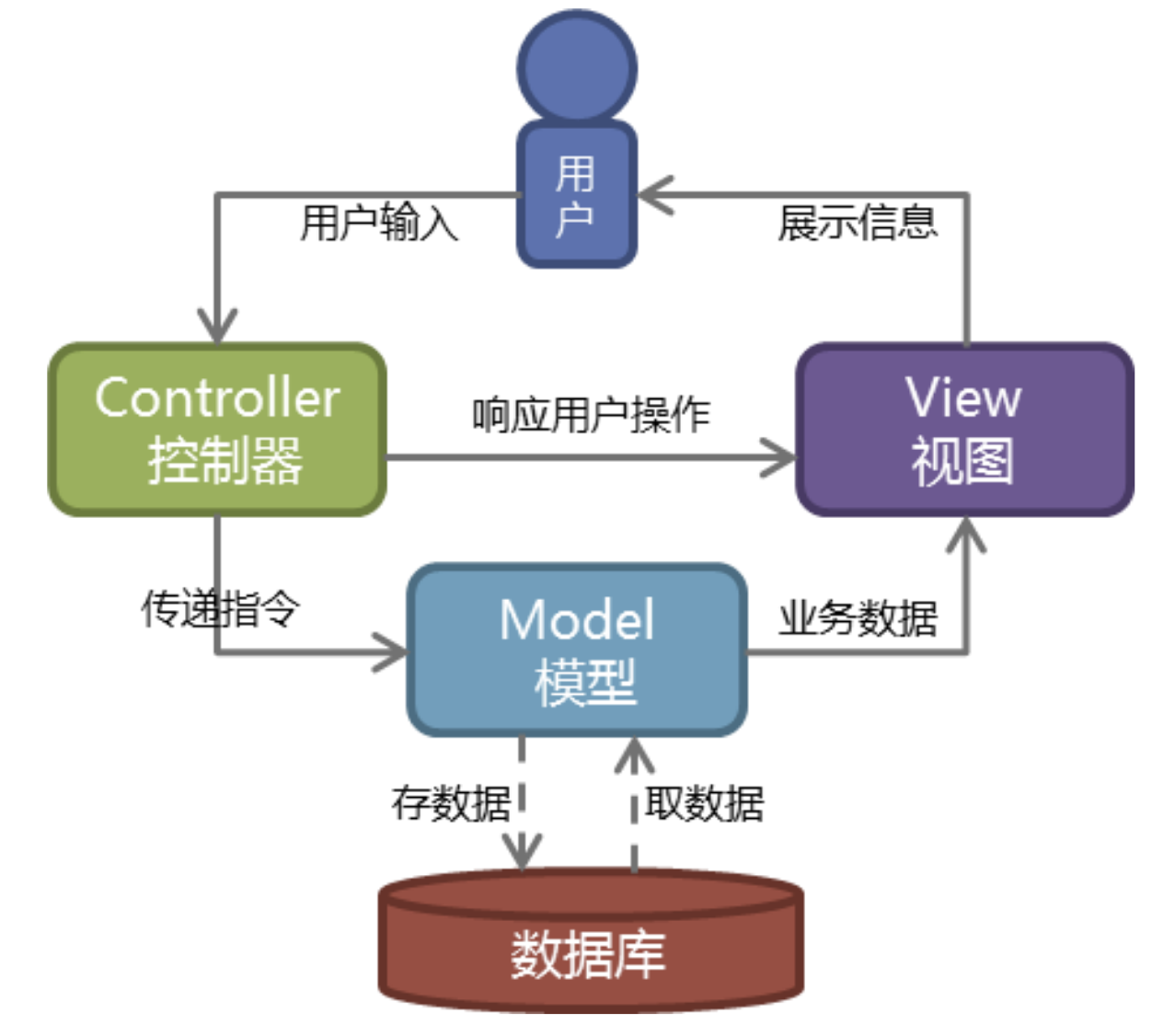 Web服务器开发领域里著名的MVC模式,所谓MVC就是把Web应用分为模型(M),控制器(C)和视图(V)三层,他们之间以一种插件式的、松耦合的方式连接在一起,模型负责业务对象与数据库的映射(ORM),视图负责与用户的交互(页面),控制器接受用户的输入调用模型和视图完成用户的请求,其示意图如下所示: