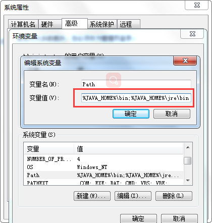 单击“编辑”按钮,在“变量值”文本框的起始位置添加“%JAVA_HOME%\bin;%JAVA_HOME%\jre\bin;”或者是直接“%JAVA_HOME%\bin;”,单击确定按钮,如图: