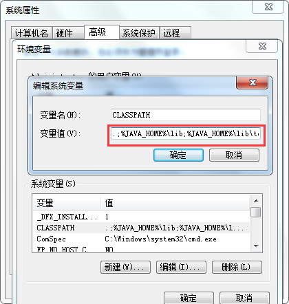 单击“编辑”按钮,在“变量值”文本框的起始位置添加“.;%JAVA_HOME%\lib\dt.jar;%JAVA_HOME%\lib\tools.jar;”。如图: