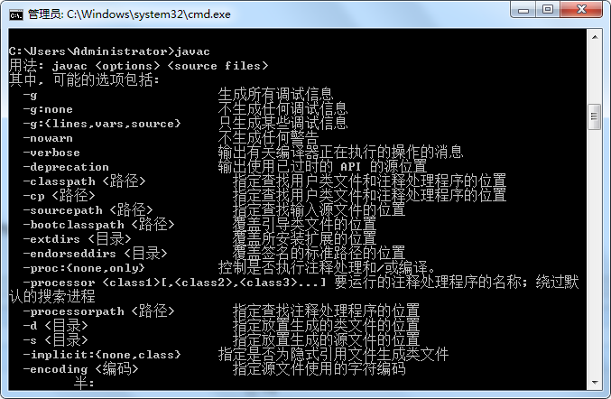 6.现在测试环境变量的配置成功与否。在DOS命令行窗口输入“JAVAC”,输出帮助信息即为配置正确。如图: