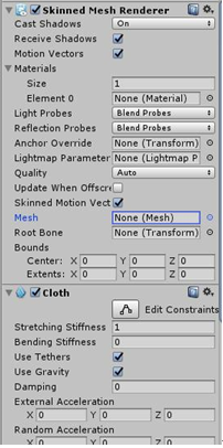 在 5.0 及以后的版本中,为提高布料的物理模拟效率,Unity3D 废弃了之前版本 中的 Interactive Cloth 和 Cloth Renderer 组件,转而使用 Cloth 和 Skinned Mesh Renderer 组件代替,以实现布料功能,其所有的参数属性也随之发生了变化。