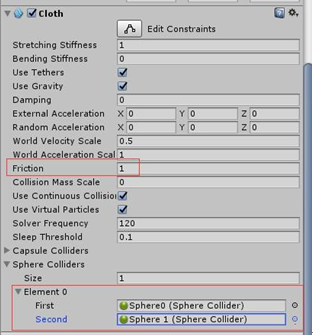 设置 Cloth 对象上的 Cloth 组件上的参数,为使效果明显,将摩擦力调为最大值 1, 然后将 Sphere0 和 Sphere1 添加成为该布料的碰撞对向,并连接成胶囊体或锥形胶 囊体。