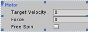 Motor 将会施加一个最大的力达到目标速度(单位:度/秒)。马达尝试去达到 targetVelocity 角速度(单位:度/秒)。如果 force 足够大,马达将会仅可能达到 targetVelocity。如果 targetVelocity 是负数,马达将会向相反的方向转动。Force 是马达可以发挥的最大转矩。如果它为零,马达将会禁用。如果 freeSpin 为 false, 当从外部施加力关节旋转快于 targetVelocity 时,最后会被还原。如果 freeSpin 为 true 当从外部施加力关节旋转快于 targetVelocity 时,最后不会被还原。