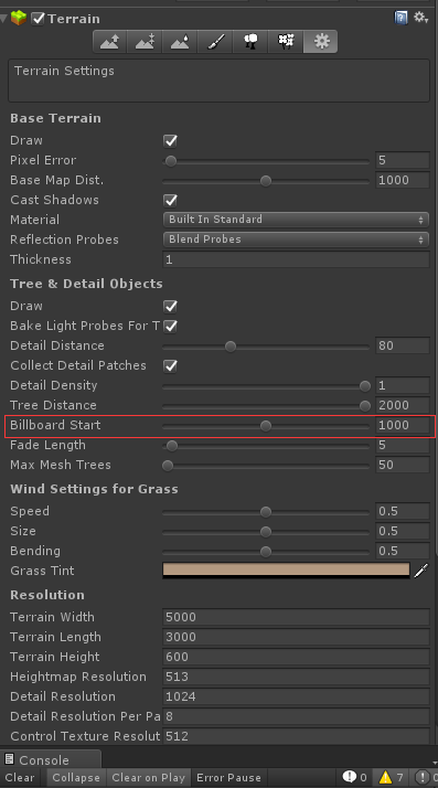 Billboard Start 该项用于设定摄像机将树渲染为广告牌的距离。