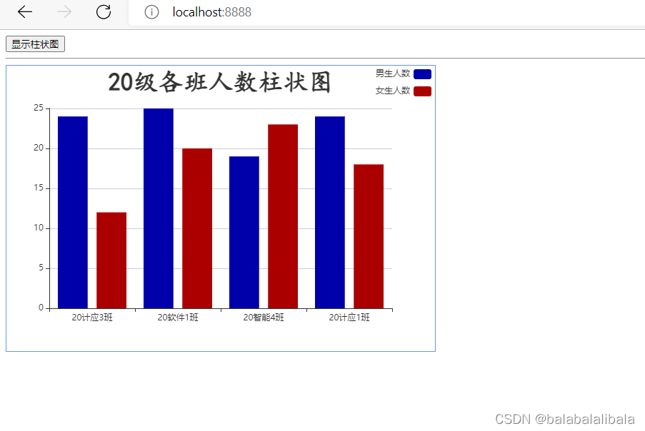 - 后端利用Spring Boot查询班级表数据,前端利用ECharts绘制各班人数柱形图。