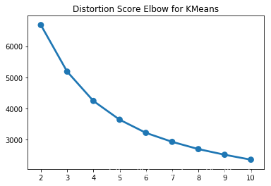 接下来试着使用K-Means算法对R,F,M的值做聚类。 首先,需要选出最合适的K值,这里使用的方法是对于每一个K值计算Distortion score,并把这个值按照K值来可视化,之后根据可视化的结果来选择合适的K值。完整的代码已经给出,只需要运行就可以看到可视化结果。