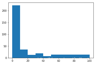 plt.hist(neg_pivot,bins=[0,10,20,30,40,50,100])