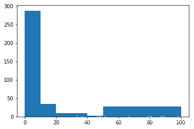 plt.hist(pos_pivot,bins=[0,10,20,30,40,50,100])