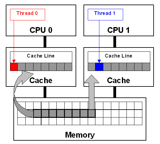 伪共享是多线程系统(每个处理器有自己的局部缓存)中一个众所周知的性能问题。伪共享发生在不同处理器的上的线程对变量的修改依赖于相同的缓存行,如下图所示:
