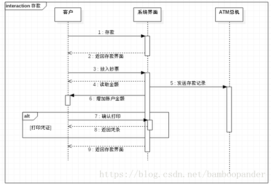 本文详细介绍了ATM系统的操作流程,包括显示初始界面、读取银行卡及身份认证、业务操作如存款和取款,以及与总机通信、管理员维护和帮助功能。通过顺序图展示了取款和存款的具体交互过程,包括客户与ATM系统之间的步骤及可能的可选流,如打印凭条和取卡操作。