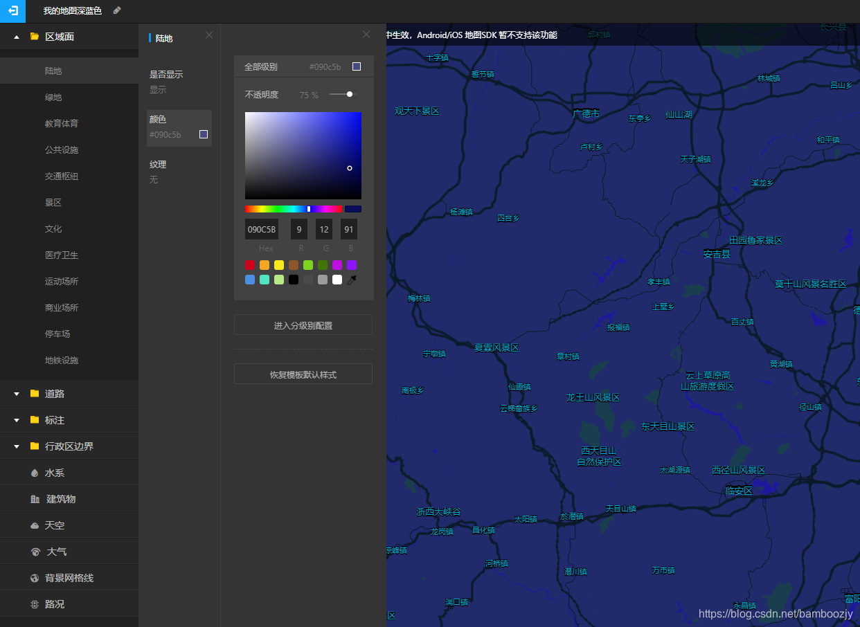 点击图片创建地图,这个基本能把地图的基色配置好,剩下的可以点击编辑进行微调,设置完成颜色后点击发布,会生成一个地图的styleid,最后使用该地图id