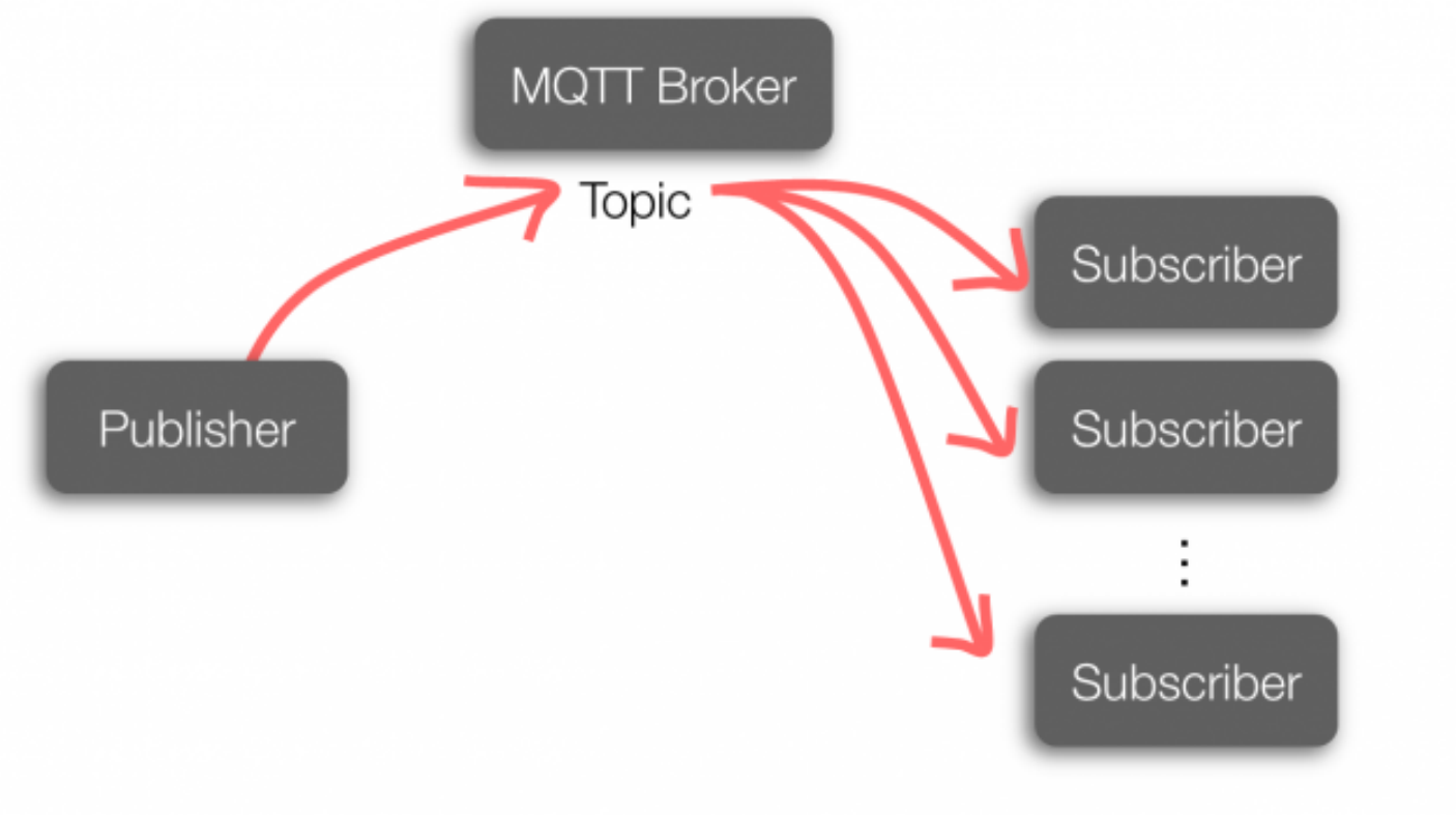 客户端向代理发布topic的消息到代理(MQTT服务程序),代理将该消息推送到所有订阅该topic的客户端。