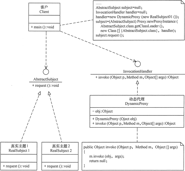 - 设计代理以前真实主题必须事先存在,不太灵活。采用动态代理模式可以解决以上问题,如 SpringAOP,其结构图如图 4 所示。
