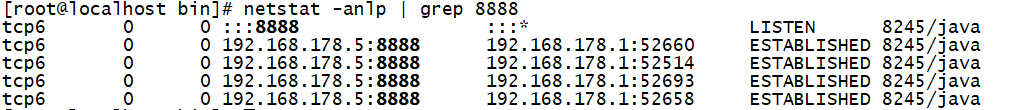 netstat -anlp | grep 8888 # netstat命令各个参数说明如下: # -t : 指明显示TCP端口 # -u : 指明显示UDP端口 # -l : 仅显示监听套接字(所谓套接字就是使应用程序能够读写与收发通讯协议(protocol)与资料的程序) # -p : 显示进程标识符和程序名称,每一个套接字/端口都属于一个程序。 # -n : 不进行DNS轮询,显示IP(可以加速操作)