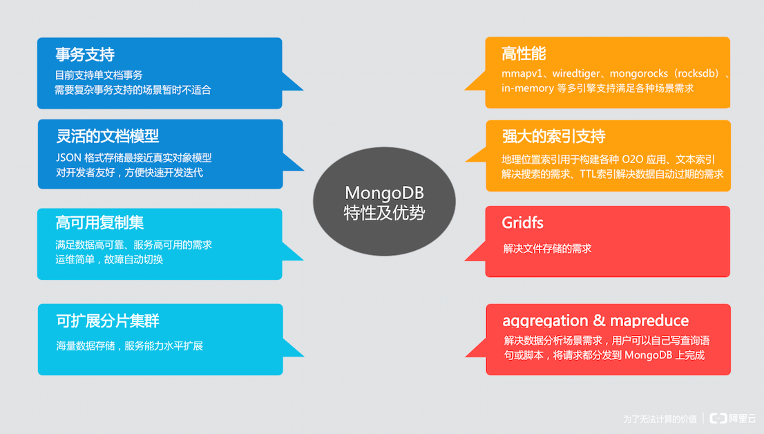 - 物流场景:使用 MongoDB 存储订单信息,订单状态在运送过程中会不断更新,以 MongoDB 内嵌数组的形式来存储,一次查询就能将订单所有的变更读取出来。