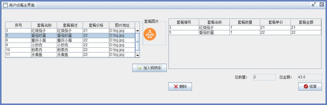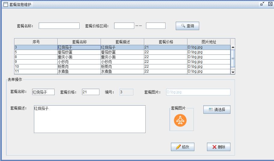 3 套餐维护:对餐厅里面的套餐进行维护,包括:新增、删除、修改。套餐信息包括:序号、名称,价格,简介、图片。