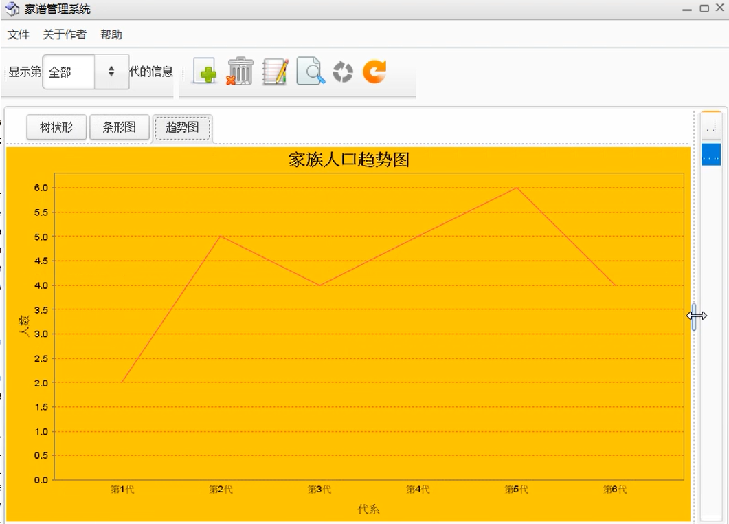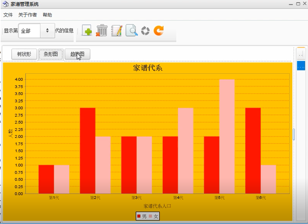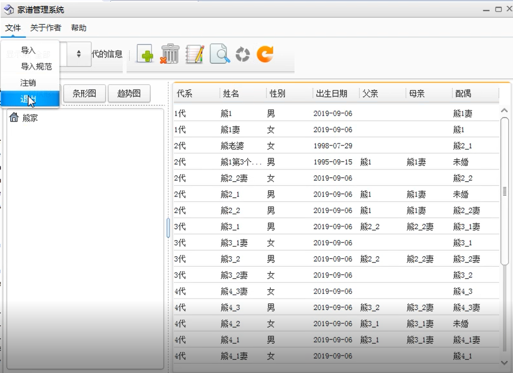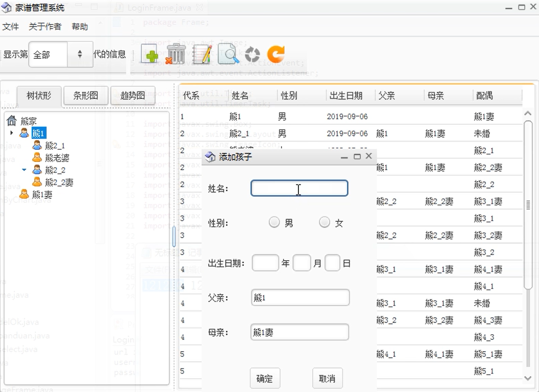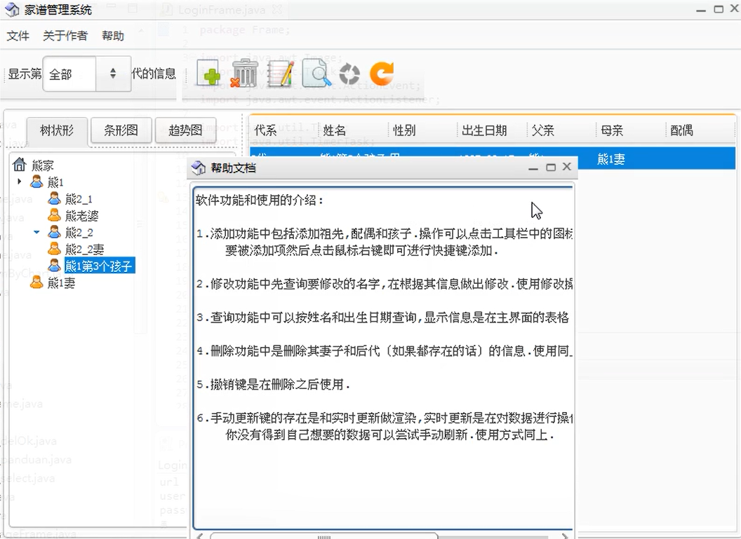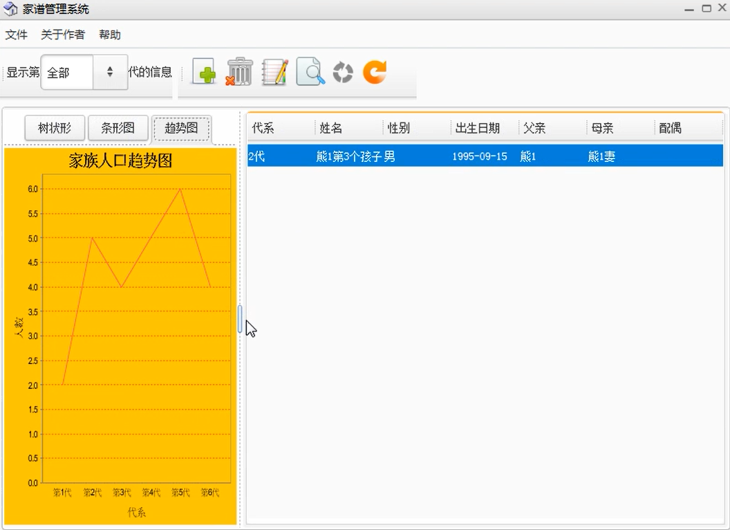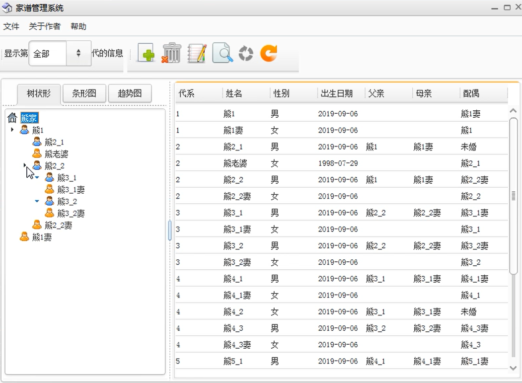 1.添加功能中包括添加祖先,配偶和孩子.操作可以点击工具栏