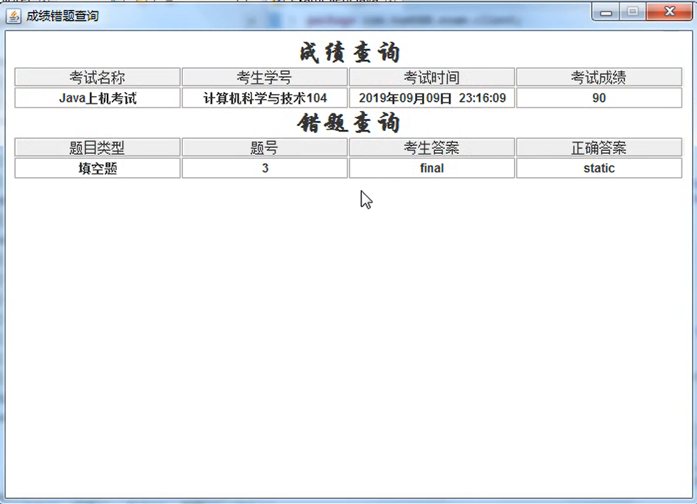 4 查看考试成绩:学生点击主界面上得查看成绩,可以查看到本次考试得成绩和错题信息。