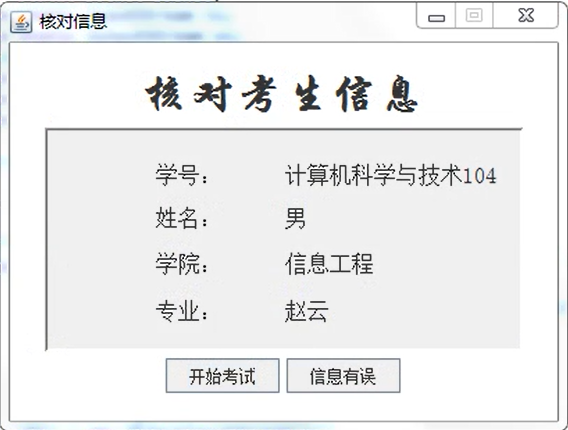 2 核对考生信息:学生在成功登陆到考试系统后,会弹出学号、姓名、专业、学院等信息,点击核对无误按钮后进入系统考试。