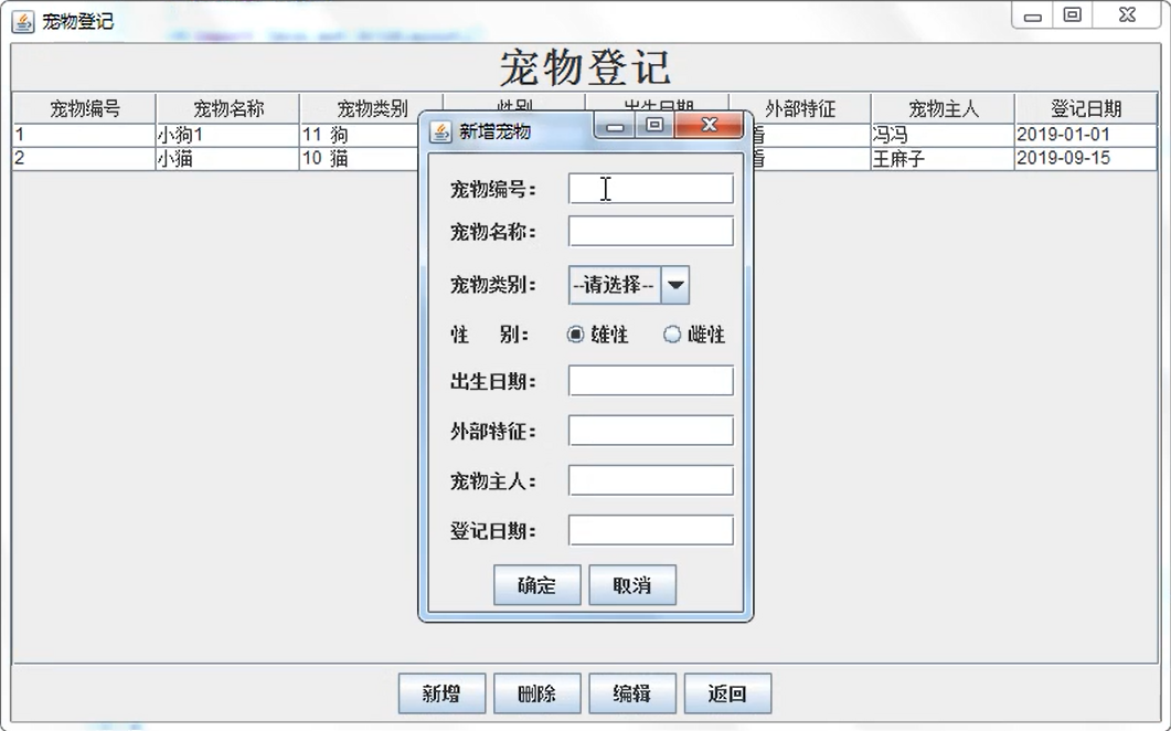 3 宠物登记:登记的信息包括:宠物编号、宠物名称、宠物类别(猫、狗)、性别、出生日期、外部特征、宠物主任、登记日期