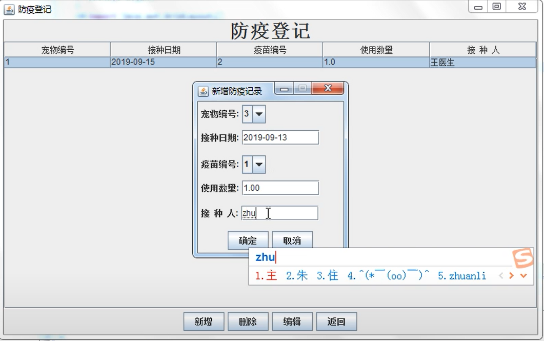 5 防疫登记:宠物编号、接种日期、疫苗编号、使用数量、接种人