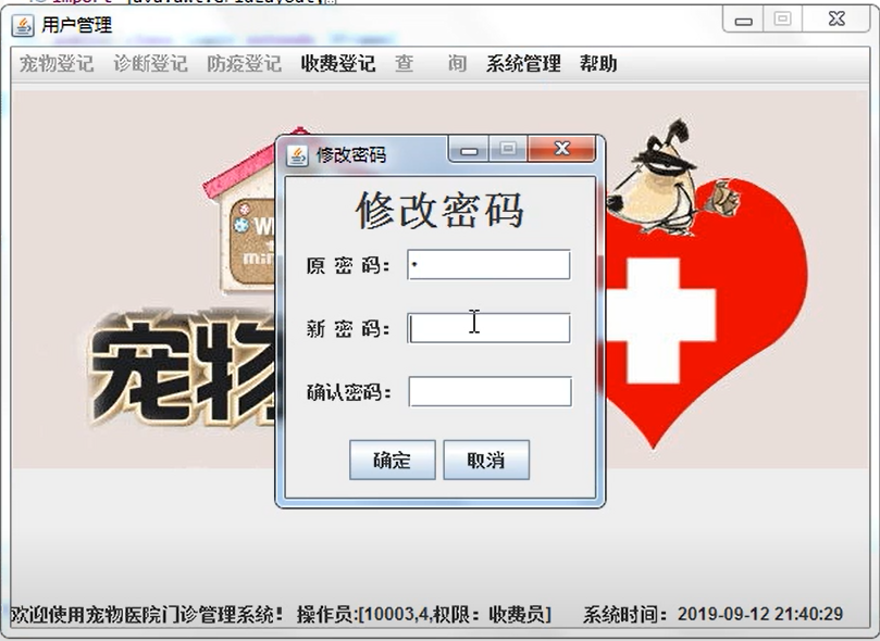 8 权限管理:整个系统分四种分四种人员,他们的权限如下:管理员(所有人员)、负责人和业务员的权限(宠物登记、宠物诊断、防疫登记业务员、收费员(收费登记)。