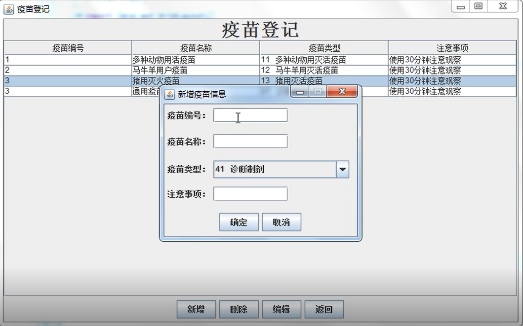 6 疫苗登记:疫苗编号、疫苗名称、疫苗类型、注意事项