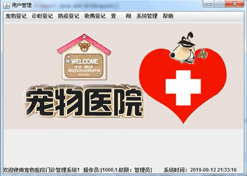 // 宠物、 诊断、 防疫登记、 收费登记、 查询、 系统管理、 帮助