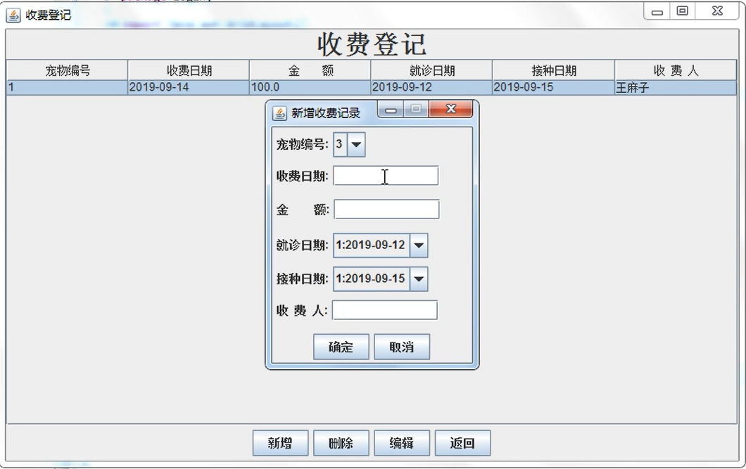7 收费登记:宠物编号、收费日期、金额、就诊日期、接种日期、收费人