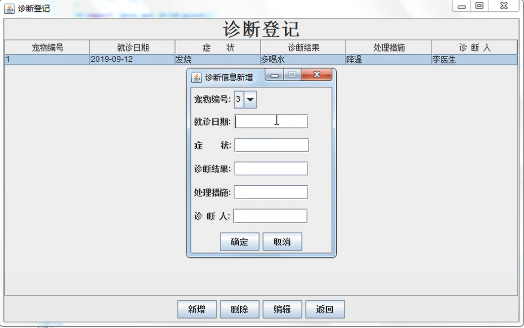 4 宠物诊断:宠物编号、就诊日期、症状、诊断结果、处理措施、诊断人