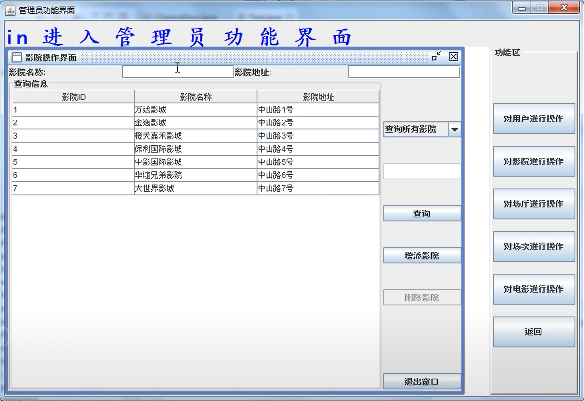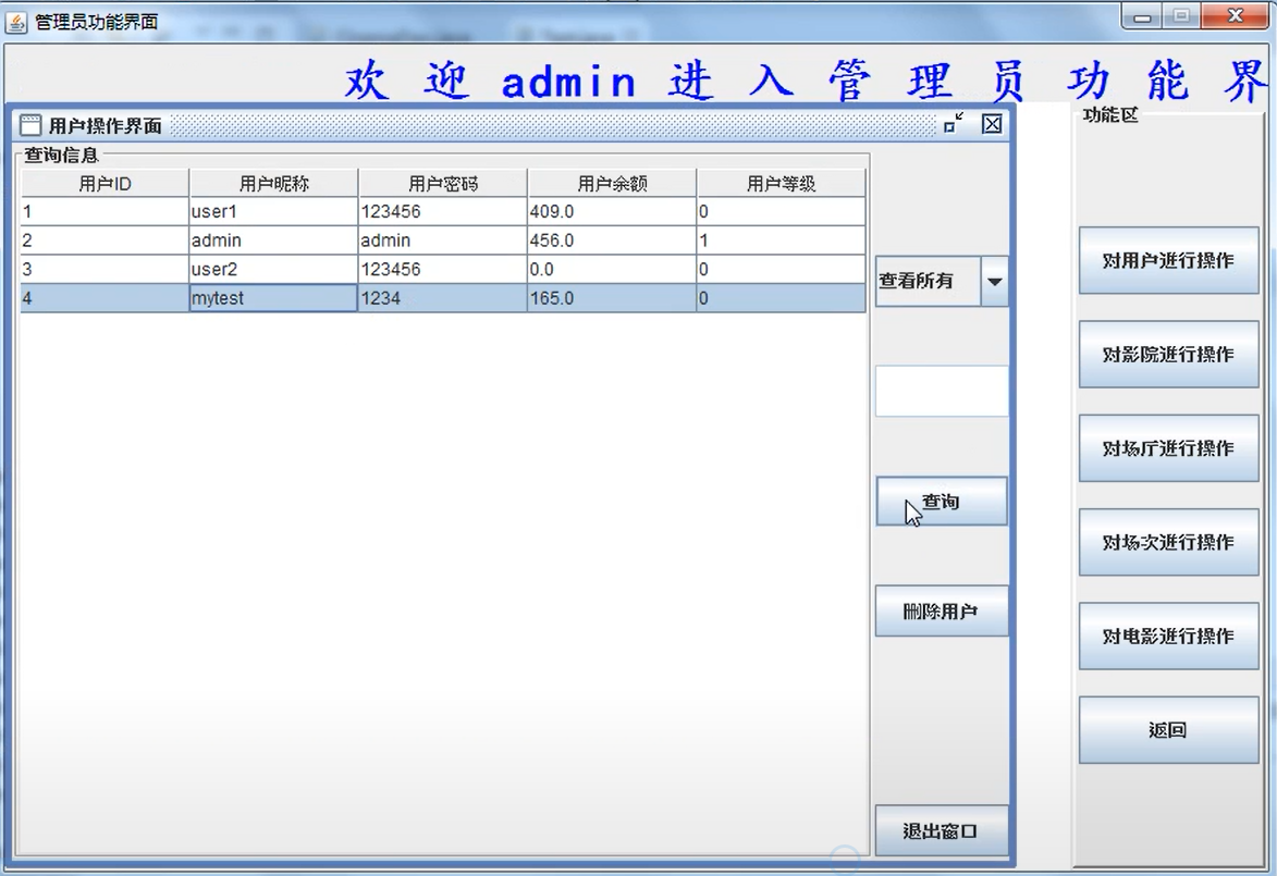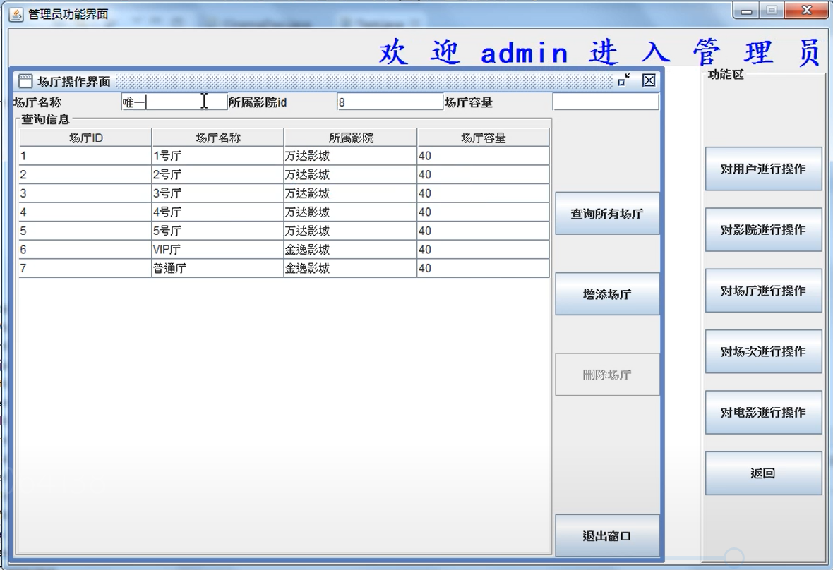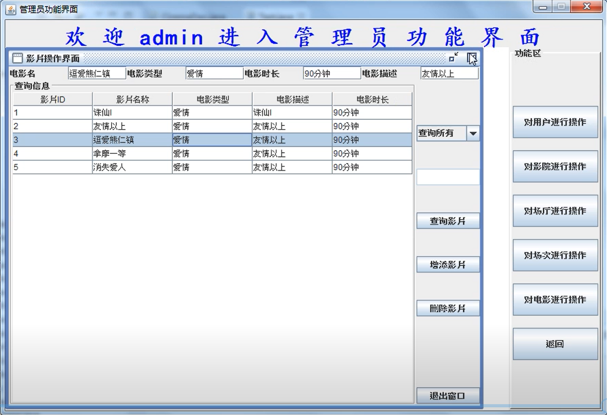 2 系统管理员主要负责系统的维护,在后台中能对用户信息,影片信息,场次信息进行增删改查