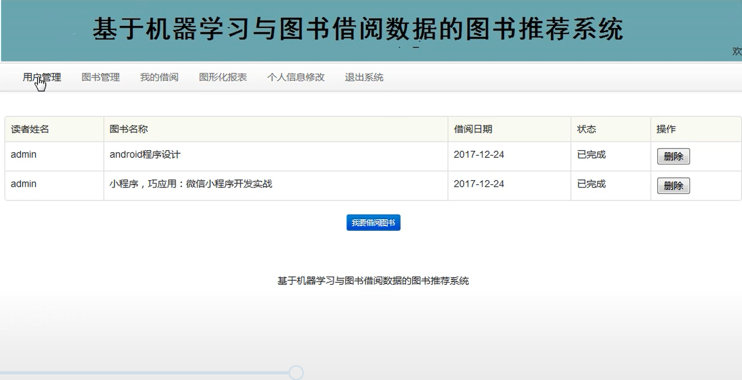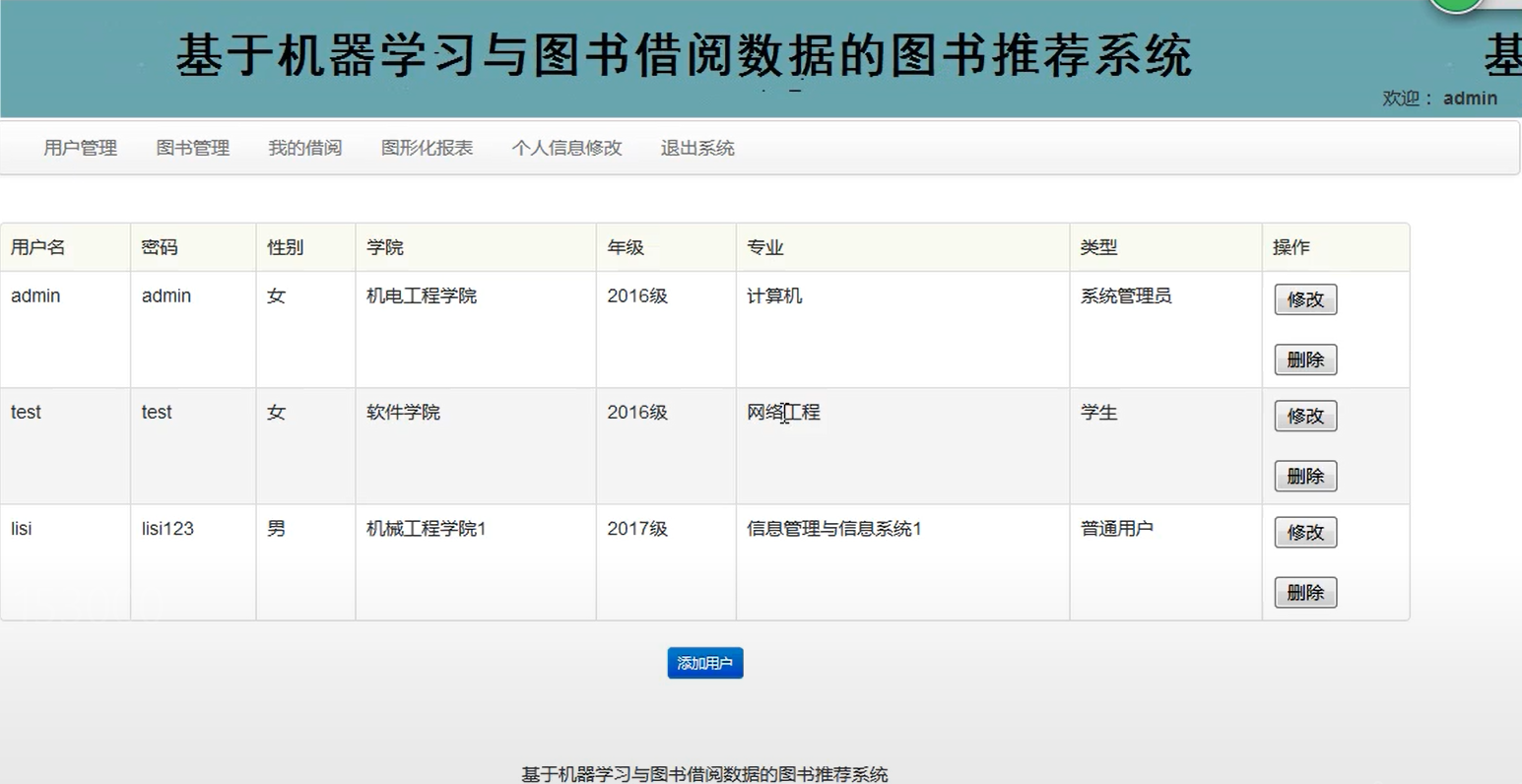 (2)管理员:用户的管理、图书的管理、图书借阅与归还、个人信息维护;其中用户的管理包括用户信息的增加、删除和修改,图书的管理包括图书信息的增加、删除和修改。同时系统管理员可以多维度分析图书的借阅情况,并且通过可视化的图表方式进行展示。