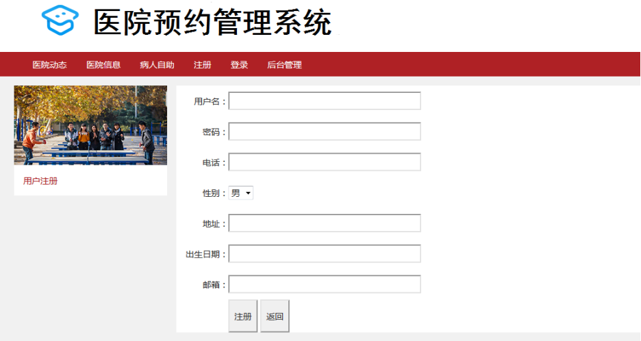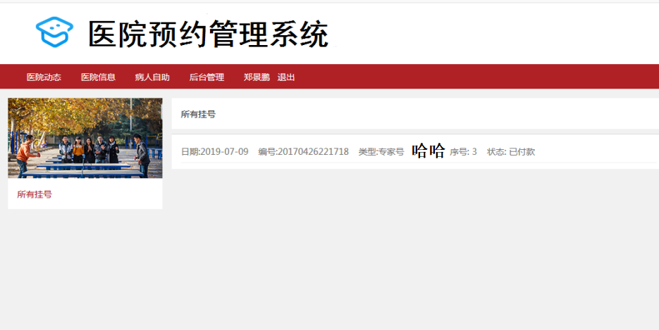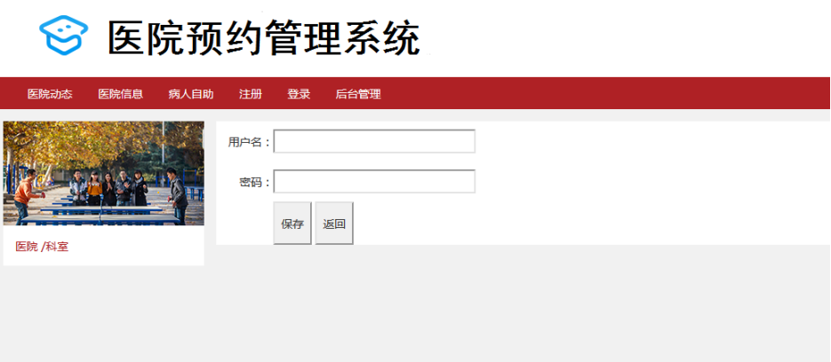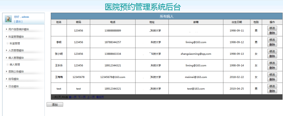 在这个模块中可以完成病人的注册,登录,修改个人信息,查看自己的预约信息,查看公告信息,发起预约。